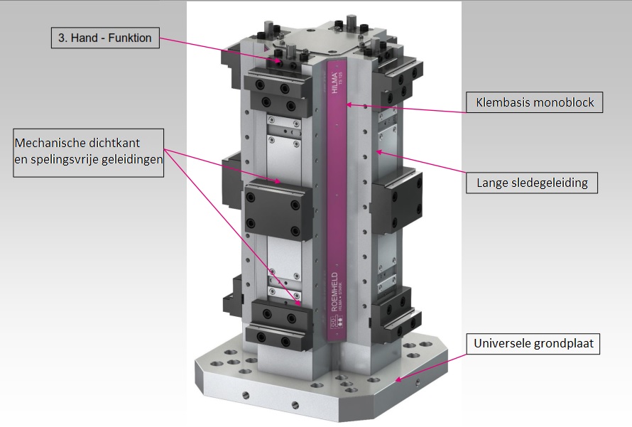 De spantorensystemen TS Vector en TS H van Hilma Roemheld zijn bij het inzetten bij half- en vol geautomatiseerde bewerkingen geschikt, omdat de spanopening en de spankracht